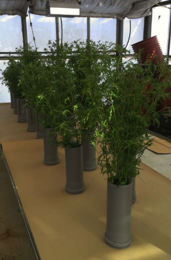 Ragweed plants separated by population and stored in a greenhouse. Vases are placed on clean paper to collect pollen that has dropped.