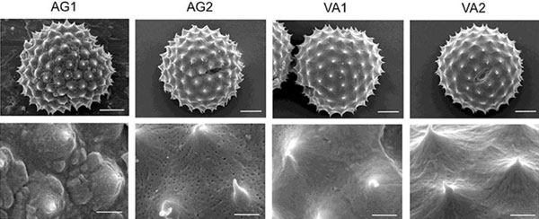 Pollen spores as seen under the electron microscope, magnified 5,000 times (above) and 21,600 times (below).
