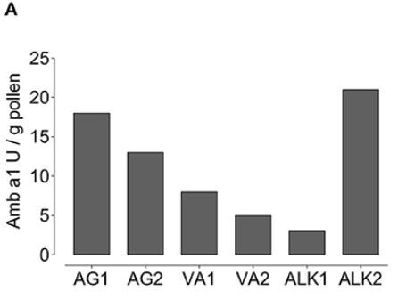 Amount of Amb a 1 allergen per gram of pollen differs among six pollen samples.