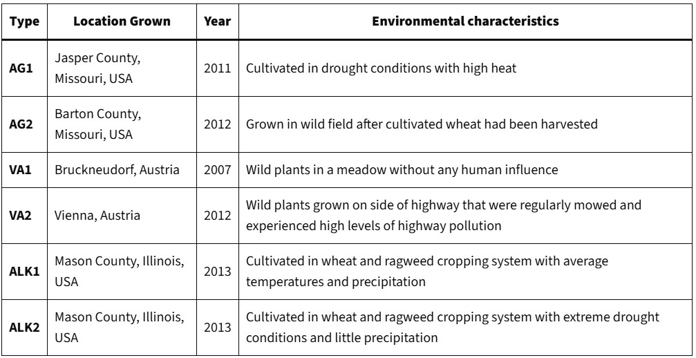 The researchers tested their hypothesis with six samples of ragweed pollen grown in different conditions. Four of the samples were cultivated in the U.S. and two of the samples were harvested wild in Austria. The six pollen samples and their characteristics are summarized in Table 1 and Figure 4.