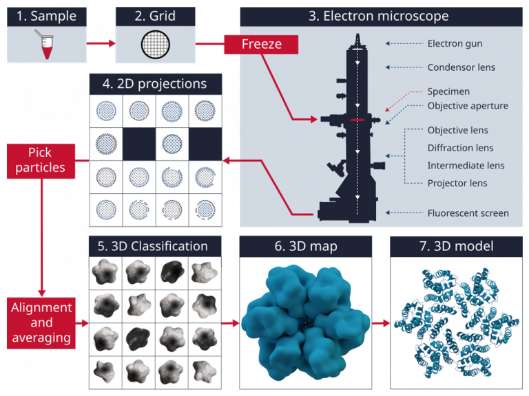 General workflow when using cryo-electron microscopy (cryo-EM). Cryo-EM allows for the creation of three-dimensional models based on two-dimensional imaging.