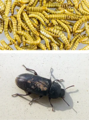 The yellow darkling beetle Tenebrio molitor in its larval stage, known as a mealworm (top) and as a mature adult (bottom).