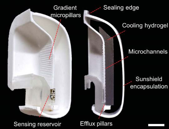 Dr. Gao designed a system using tiny channels called microchannels that mimicked how plants use capillary force. These microchannels continuously transport condensate from the inside of the smart mask to the sensors on the outside of the mask.