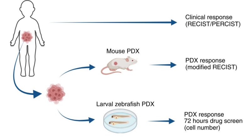 The researchers compared the clinical response of each patient to their treatment based on the Response Evaluation Criteria in Solid Tumors (RECIST) or Positron Emission Tomography Response Criteria in Solid Tumors (PERCIST) criteria to the response of the mouse PDX model based on modified RECIST criteria and the response of the zebrafish PDX model.
