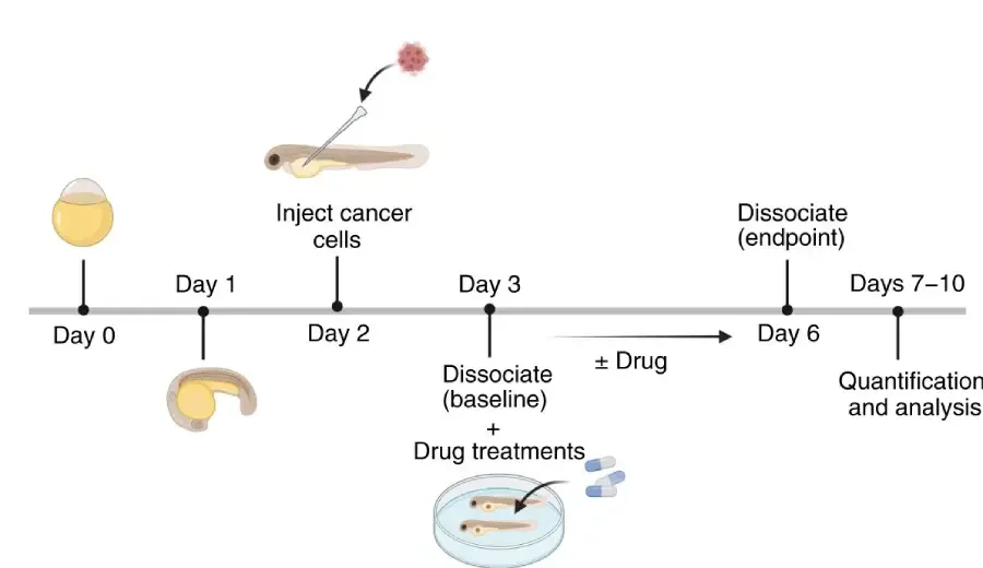 In the zebrafish PDX model Dr. Berman developed, tumor cells are injected into the zebrafish at two days of age. At Day 3, treatments are added into the water and absorbed by the zebrafish. Over the next 4-7 days, the researchers observe what happens and analyze the results.