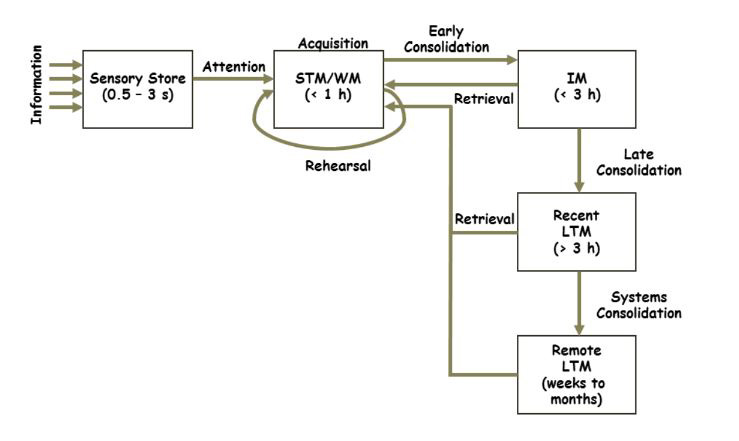 The process of making memories involves acquisition (short term memory (STM)/working memory (WM)), consolidation to intermediate memory (IM) and long-term memory (LTM), and retrieval. Information reaches the senses (sensory store) before attention to the information leads to its acquisition. Time periods refer to the average time information is retained.