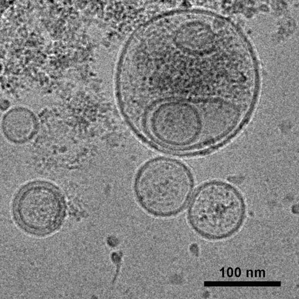 Transmission electron microscopy image of extracellular vesicles derived from human nasal epithelial cells.