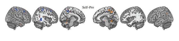 Comparison of brain areas activated in the self-viewing and other-viewing conditions. The orange represents areas that were activated with more blushing in the self-viewing condition compared to the other-viewing condition.