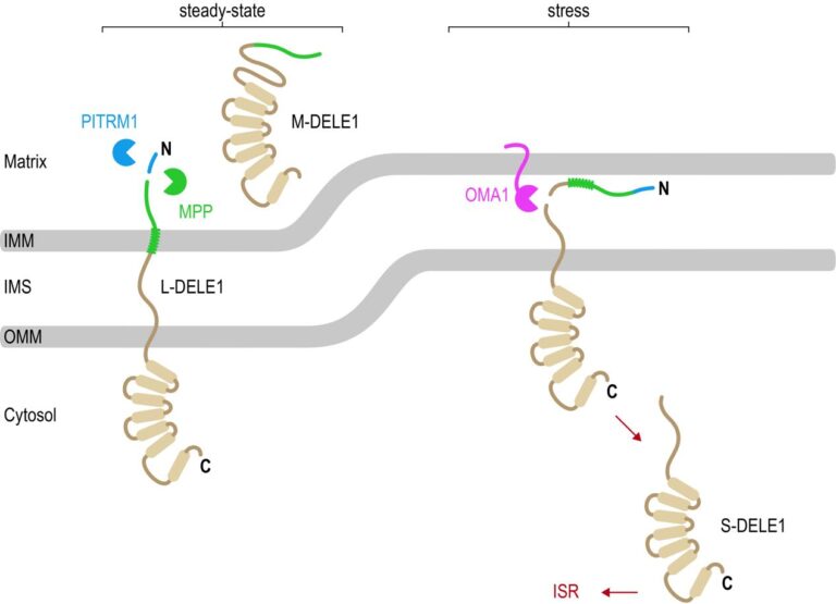 “These results explain how DELE1 can move from mitochondria to the cytosol and how DELE1 and OMA1 interact with each other,” explained Dr. Fessler. “Mitochondrial stress leads to defects in the import of DELE1 such that DELE1 becomes arrested across the mitochondrial membrane(s) with part of it remaining in the cytosol. This way the DELE1 protein becomes available for OMA1 to cleave into S-DELE1. S-DELE1 can then slip back into the cytosol where it binds to HRI leading to its activation.”