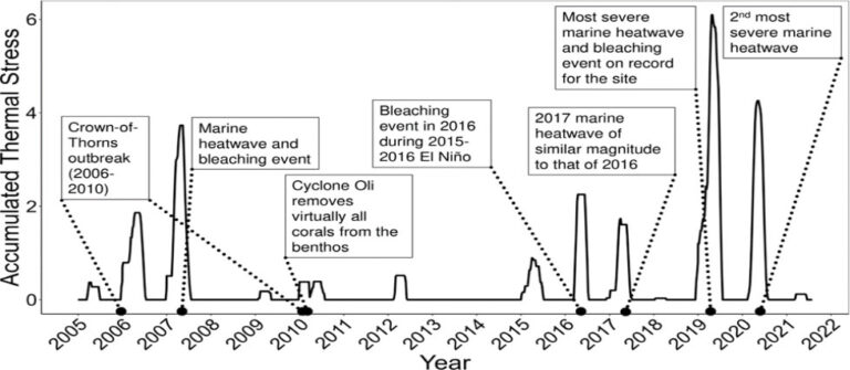 Recorded history of disturbance at the research site, 2005-2021. The research for the study described here took place from 2018 to 2020. Thermal stress is another term for heat stress; benthos refers to the sea floor; el niño is a weather phenomenon that causes increased ocean temperatures.