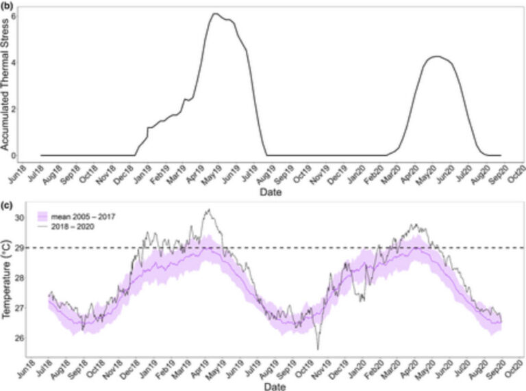 Accumulated thermal (heat) stress (above) and water temperature (below) of the study site 2018-2020.