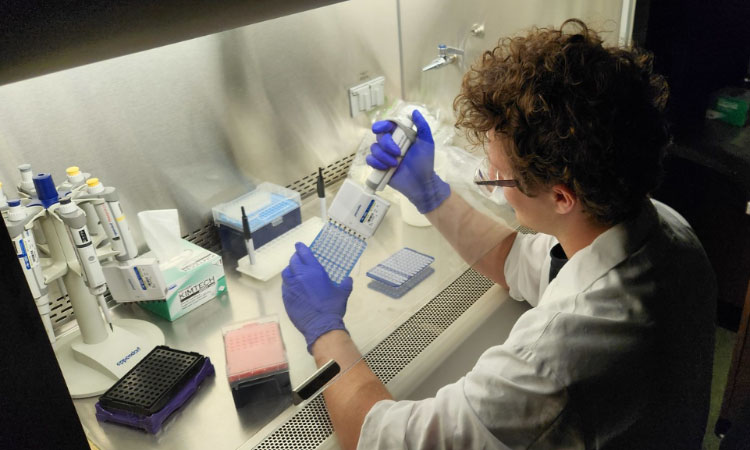 Alex Vompe performing genetic analysis on a coral microbiome sample.