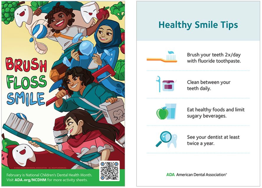 The theme of National Children’s Dental Health Month 2023 is “Brush, Floss, Smile.”
