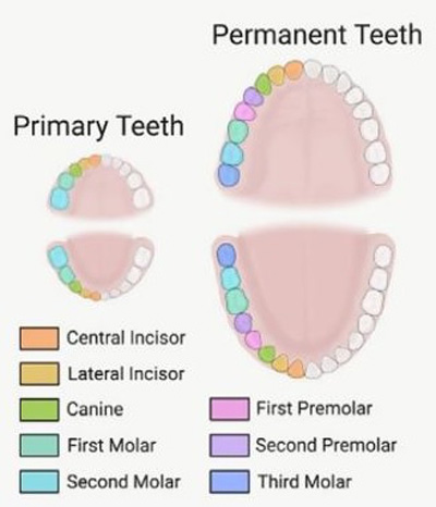Types of teeth in children (primary teeth) and adults (permanent teeth).