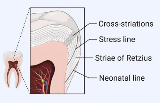 Just as one can look at the size of the rings on a tree to identify years of more growth or less, the width or color of growth lines in tooth enamel can also indicate times of stress. Researchers have found that thicker or darker growth lines in teeth, often called “stress lines”, can be indicators of dietary stress or scarcity in the food supply. One of the most prominent growth lines in baby teeth is called the neonatal line, which forms right around the time of birth. The neonatal line can be used to differentiate between the parts of the tooth that formed during pregnancy from the parts of the tooth formed after birth. Previous studies have shown that a thicker neonatal line could indicate increased stress right around the time of birth.