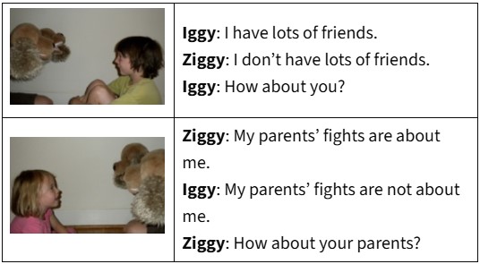 Examples of the Berkeley Puppet Interview with puppets Iggy and Ziggy interacting with a child.