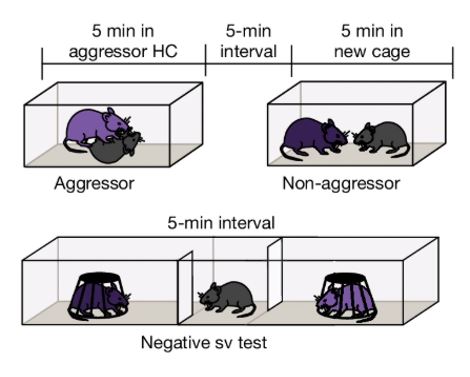 Experimental model to assess negative social valence (sv) in mice. The subject mouse (grey) was placed into the aggressor’s cage (left) for 5 minutes and a neutral (non-aggressor) mouse’s cage for 5 minutes. Then the mouse was placed in a three-chamber box between the aggressor and non-aggressor. The researchers assessed social valence based on the amount of time the subject mouse spent in each chamber.