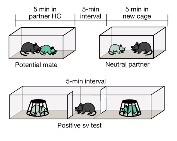 Experimental model to assess positive social valence (sv). The subject mouse (grey) was placed into the potential mate’s cage (left) for 5 minutes and a neutral mouse’s cage for 5 minutes. Then the mouse was placed in a three-chamber box between the potential mate and neutral partner. The researchers assessed social valence based on the amount of time the subject mouse spent in each chamber.